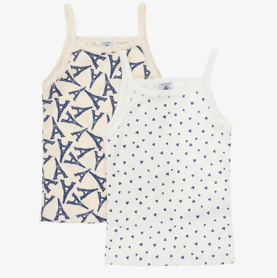 Two organic cotton vest tops for girls by Petit Bateau, in pale and deep ivory with blue accents. Made in soft, stretchy jersey and trimmed with picot edges, one is patterned with hearts and the second is decorated with Eiffel Tower prints.