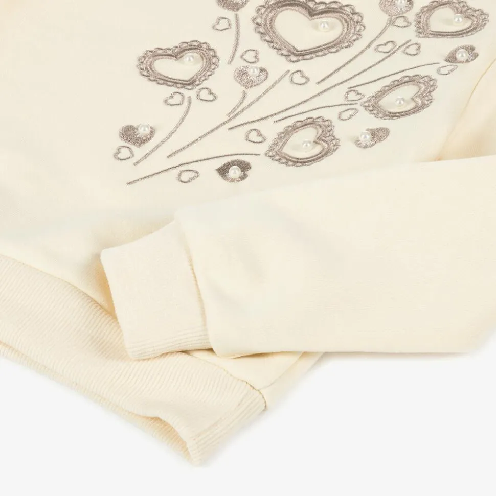 Dark ivory sweatshirt for girls by Le Chic, made in comfortable mid-weight cotton jersey. It features a lovely beige embroidered heart design trimmed with pearl beads for a beautiful touch.