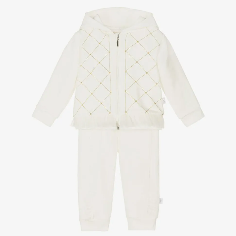 Ivory tracksuit for little girls by Sofija, made from soft cotton jersey. Trimmed with a tulle ruffle, the zip-up hoodie has a stylish check design on the front, embroidered in shimmery gold thread. The matching joggers have a gently elasticated waistband for a comfortable fit.