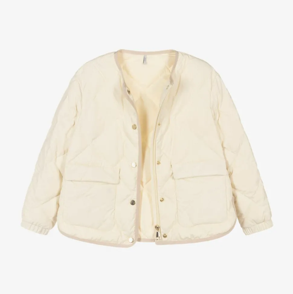 Stylish, ivory quilted jacket for girls by luxury brand Moncler Enfant. It is made in water-repellent recycled fabric with a matt finish and is padded in warm down. It has grosgrain trims in contrasting beige, useful front flap pockets secured with poppers and the signature logo badge sewn on one sleeve. To keep the chilly weather out, it has gently elasticated cuffs and a zip fastening with a flap over, closing with shiny gold, branded poppers. The jacket has a silky matt lining.