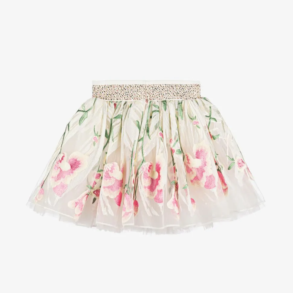 A gorgeous ivory tulle skirt for girls by Junona, beautifully embroidered with flowers in pink and green, and scattered with sparkly sequins. Ideal for a special occasion, layers of tulle create a charming silhouette and the stretchy waistband is decorated with shiny studs and a gold metal logo plate. A lightweight cotton lining completes the style with comfort.