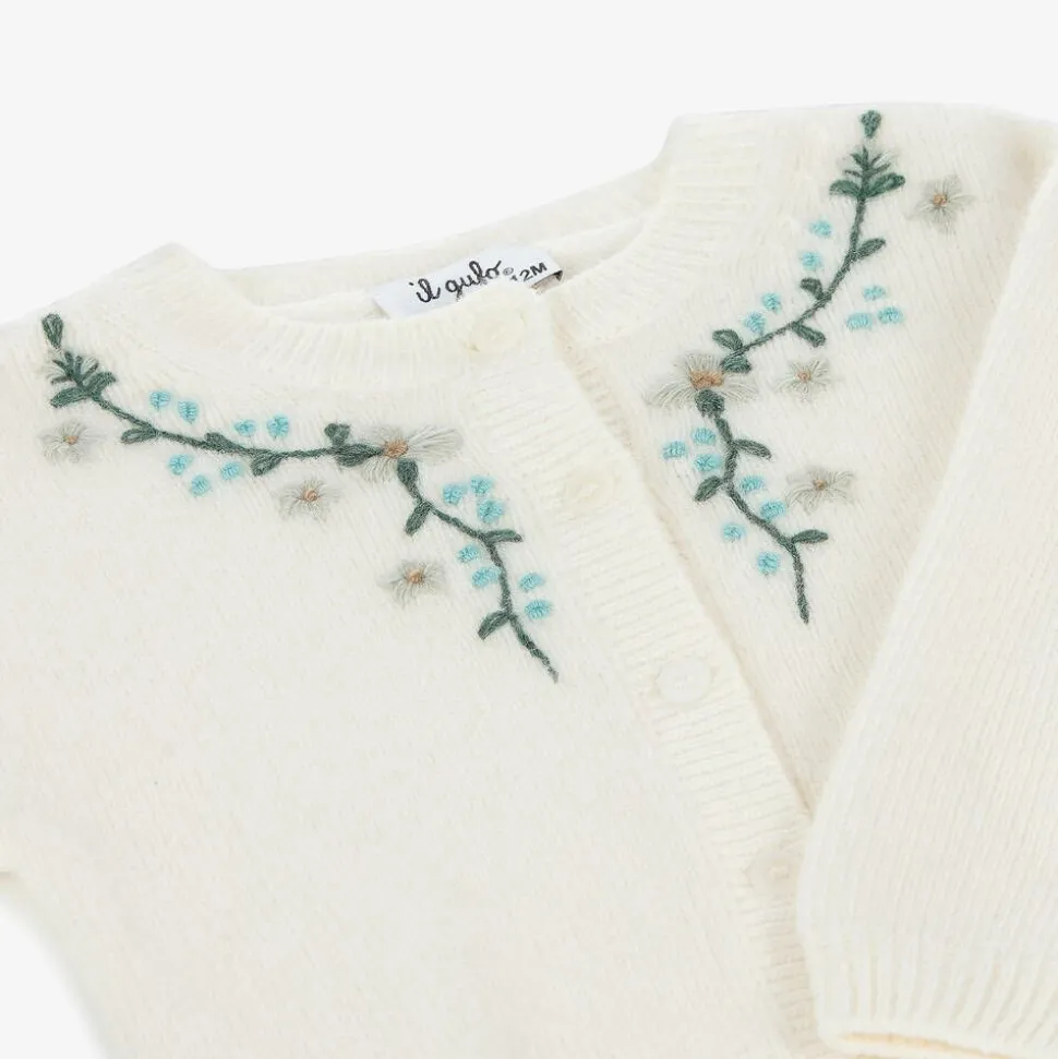 Beautifully hand-embroidered with a floral design in green, beige and blue, this ivory cardigan for little girls is from luxury Italian brand, Il Gufo. A classic crew neck design, it is softly knitted in wool for a gentle yet cosy feel against the skin. Adding a designer touch, the button fastenings are patterned with logos and there is an embroidered grey logo above the front hem.