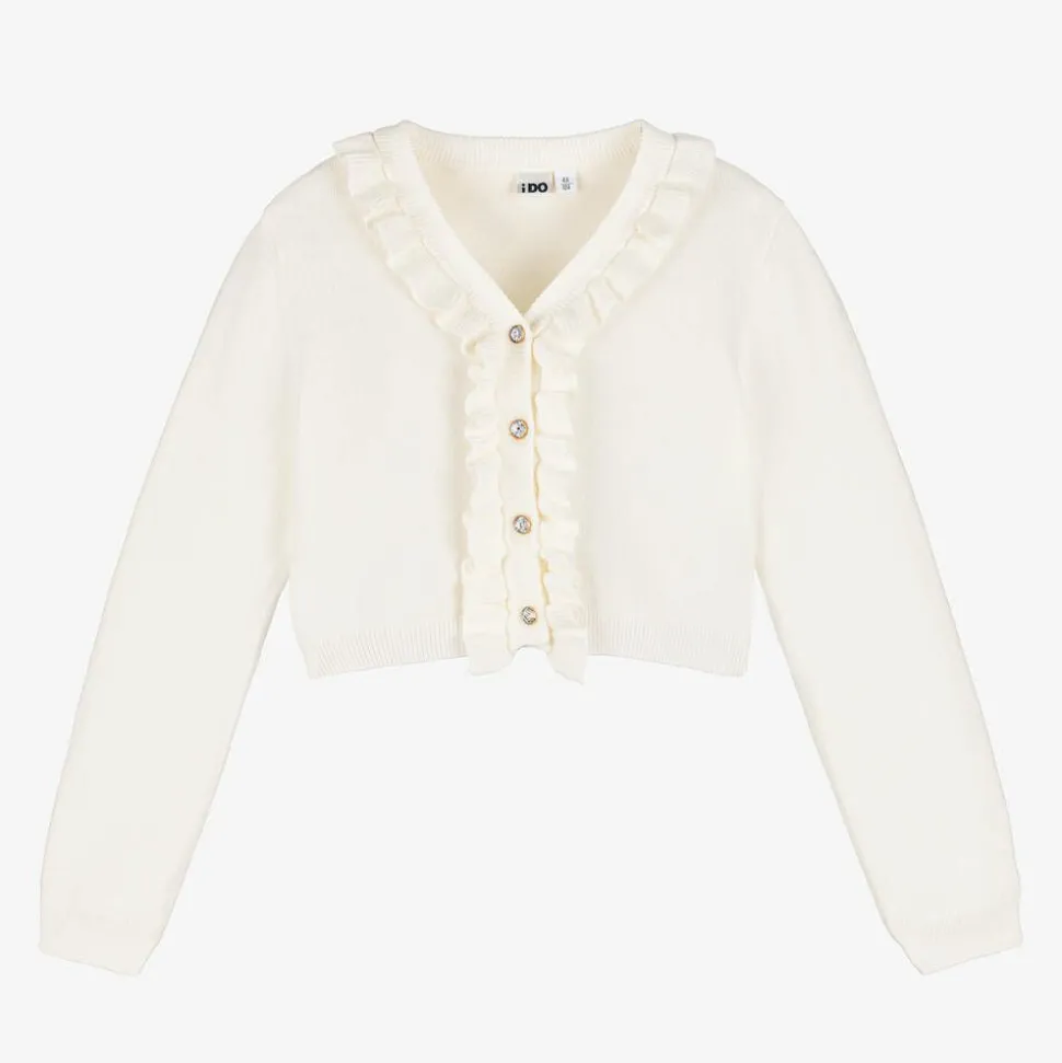 A sweet ivory cardigan for girls by iDO Baby, made in a beautifully soft viscose blend. It has pretty frill detailing and sparkling crystal-effect buttons for added charm. It has a smart V-neckline and can be easily layered over dresses and blouses for extra coverage.