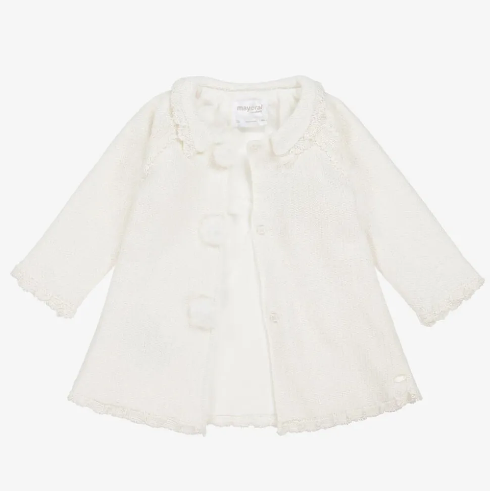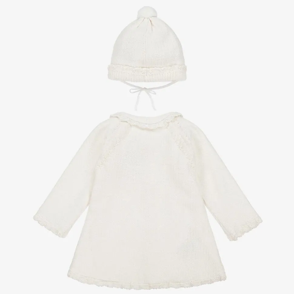 Ivory pram coat and hat set for baby girls by Mayoral, knitted in a soft cotton and viscose blend. Keeping little ones warm and snug, this adorable layer has scalloped trims and faux fur pom-poms on the front. It has a beautifully soft velour lining, a classic collar and concealed popper fastenings. The matching hat has a cute pom-pom on the top and easy tie fastenings that secure comfortably under the chin.