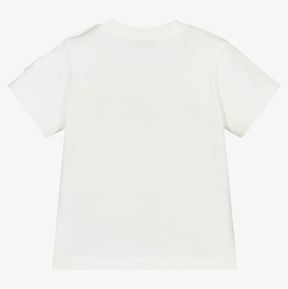 Little girls ivory cotton T-shirt by Moncler Enfant. There is a red and beige 'LOVE' appliqué on the front and popper fastenings on one shoulder, with a logo badge on one sleeve.