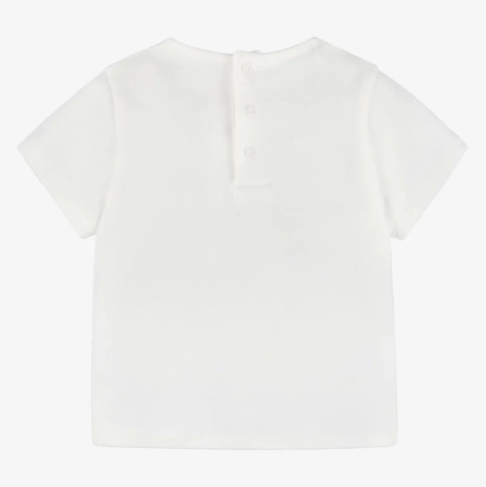 Classic ivory short-sleeved T-shirt for little girls by luxury French fashion house ChloĆ©, with a large, beautifully embroidered ivory logo on the front. It is made in comfortable, organic cotton jersey and has useful popper fastenings on the back.