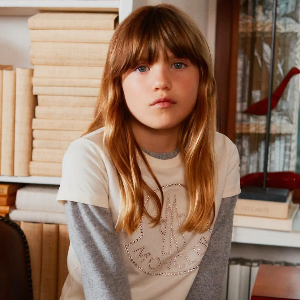 Ivory T-shirt for girls by luxury brand Moncler Enfant, made in soft cotton jersey. It has a rhinestone studded logo on the front and the iconic felt logo patch stamped on one sleeve, adding instant designer appeal.