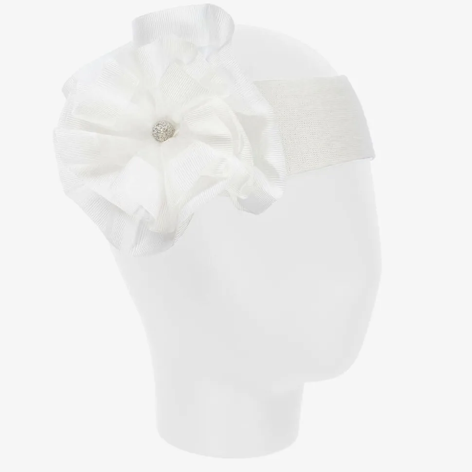 Baby girls ivory headband by Beau Kid. Soft and stretchy, the wide band is decorated with an ivory grosgrain ribbon and organza ruffle rosette with a sparkly silver ball centre.