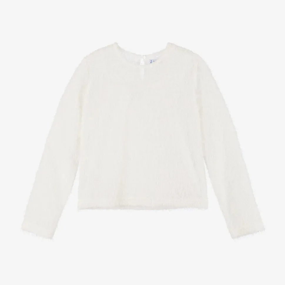 Pretty ivory long-sleeved top for older girls by Mayoral. Soft and stretchy, it is made in a lightweight knit with a fluffy look and silver threads for added sparkle. It has a single button fastening on the back. This versatile top comes with a cotton jersey camisole, which can also be worn separately.