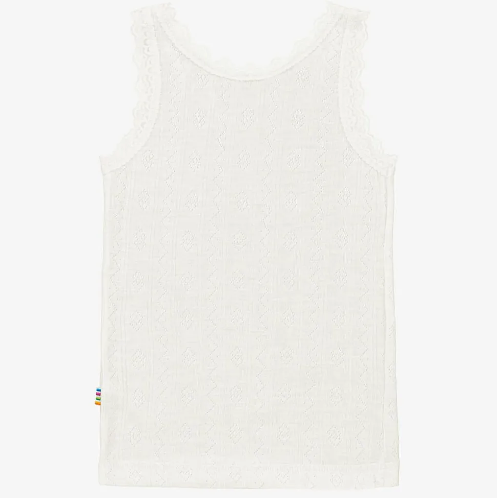 A ivory thermal vest top with pretty lace trims for girls by Joha. Super soft and comfortable, it is made in a lightweight Merino wool and silk blend.