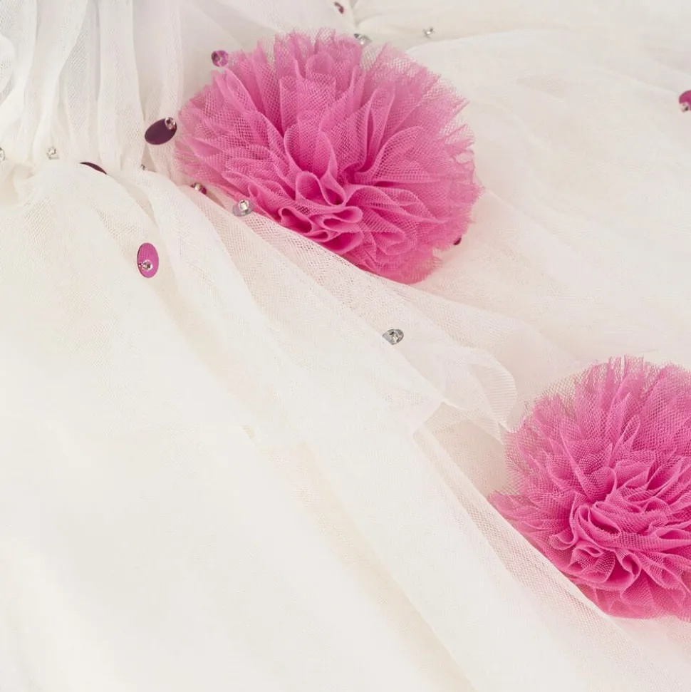 Fun ivory Harlequin costume top for girls by Tutu Du Monde, made in soft, layered tulle. It has large, bright pink pom-poms on the front, whilst the shimmering sequins on the ruffled collar and cuffs provide a finishing touch. Items are made to last and become more lovely with wear as slight fading and fraying edges adds to their charm.