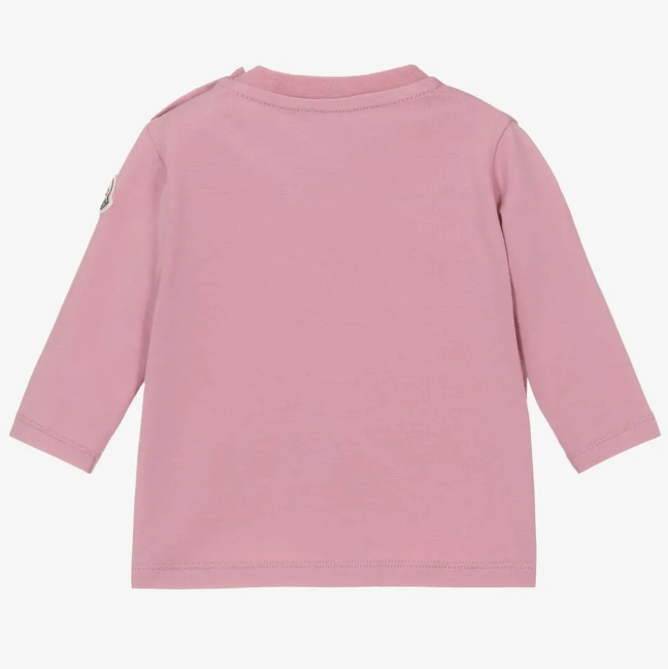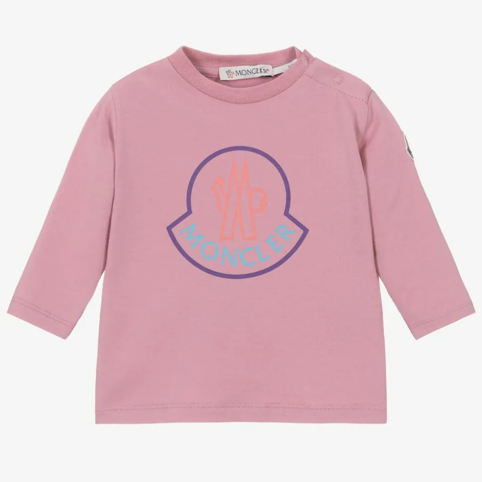 Long-sleeved top for little girls from luxury brand Moncler Enfant, in a lovely lilac pink shade. Made in soft and comfortable cotton jersey, it has a casual crew neck and easy popper fastenings on one shoulder. It is printed on the front with the designer's iconic logo in purple, pink and blue and has a felt logo patch on one sleeve for a signature finish.