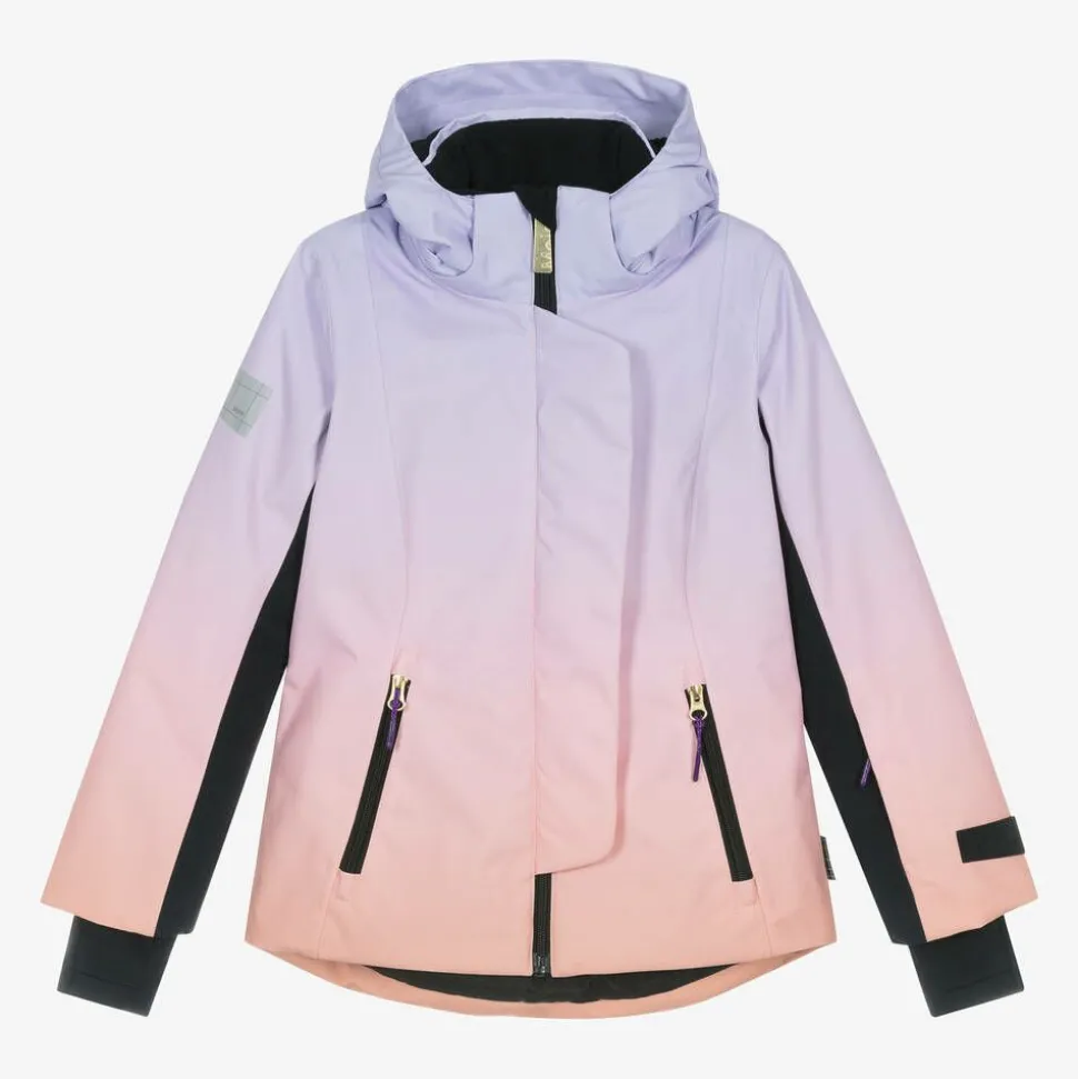 Technical ski jacket for girls by Molo, in gradient lilac purple and pink tones. Made from recycled fabric with waterproof and windproof features, it is insulated to withstand temperatures up to -25C and has a polar fleece lining with a mesh layer for breathability. This slope-ready jacket has reflective logo trims, a removable hood with an elasticated trim to fit easily over a helmet, zip-up front pockets and a ski pass pocket on one sleeve. There is an internal popper fastening snow skirt and stretchy cuffs with comfortable thumbholes. Covering the main zip, the storm flap fastens with poppers on the front.