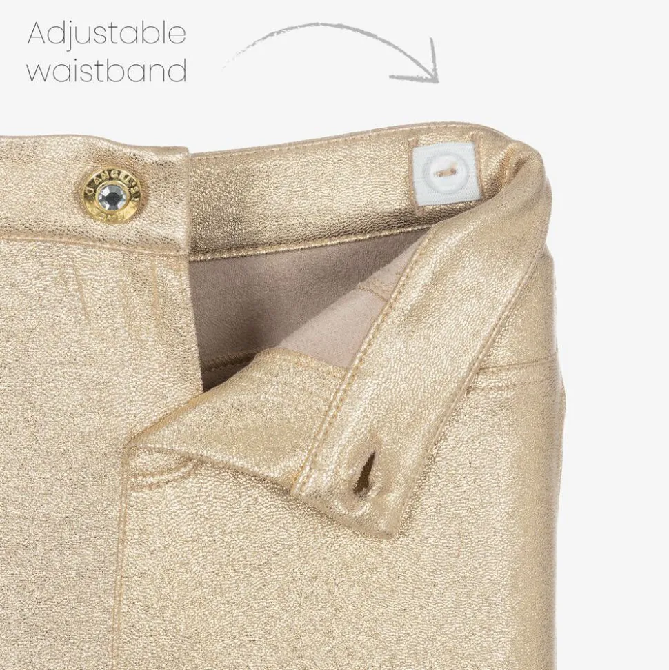 Metallic gold jeggings for girls by British brand Angel's Face, made in soft stretch fabric with a gorgeous shimmer. Great for a party, these comfortable jeggings have a beautifully soft, suede-like texture inside. They fasten with a gold, logo-branded button and are fully adjustable on the waist for a desired fit.