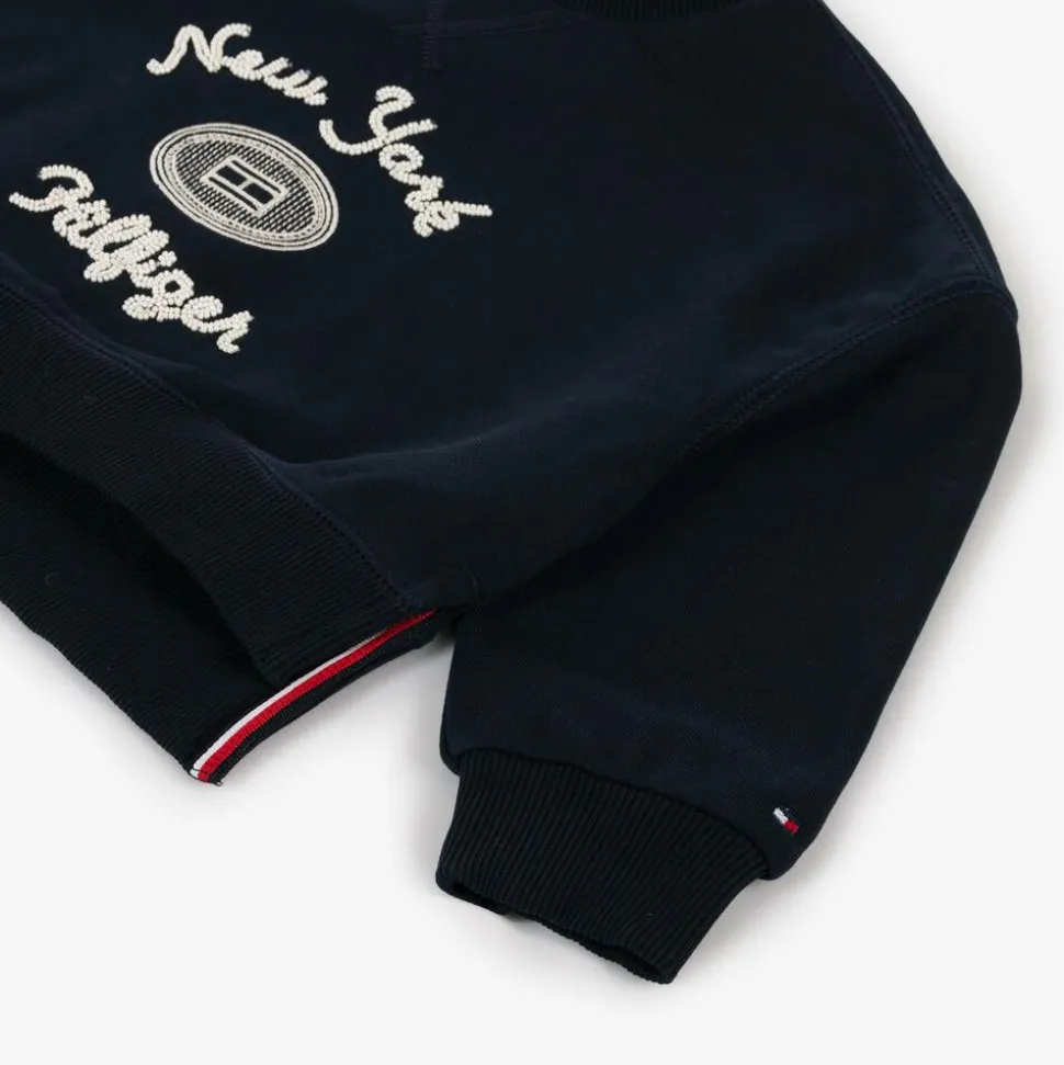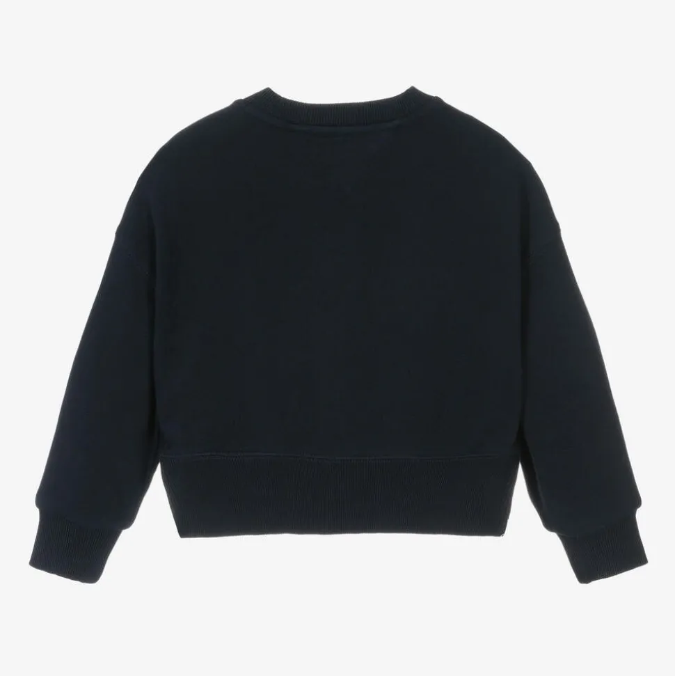 A navy blue sweatshirt for girls by Tommy Hilfiger, made in a mid-weight cotton jersey blend for added comfort. This crew neck sweatshirt has dropped shoulders and ribbed detailing. The split hem is longer at the back and is trimmed with signature stripes in red, white and blue. A tactile New York logo on the front is formed with little white beads to make a designer statement.