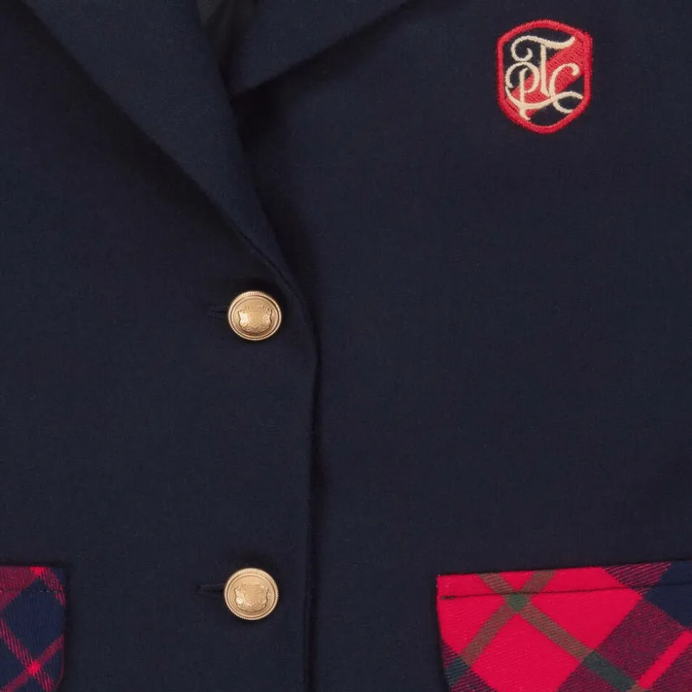 Smart navy blue blazer with red tartan trim for girls by Patachou, exclusive to Childrensalon. Made from a soft viscose blend, this satin-lined jacket has a revere collar, faux pocket detail, and gold crest button fastenings. An embroidered logo on the chest adds a classic touch and there are pleats on the front hem for a stylish finish.