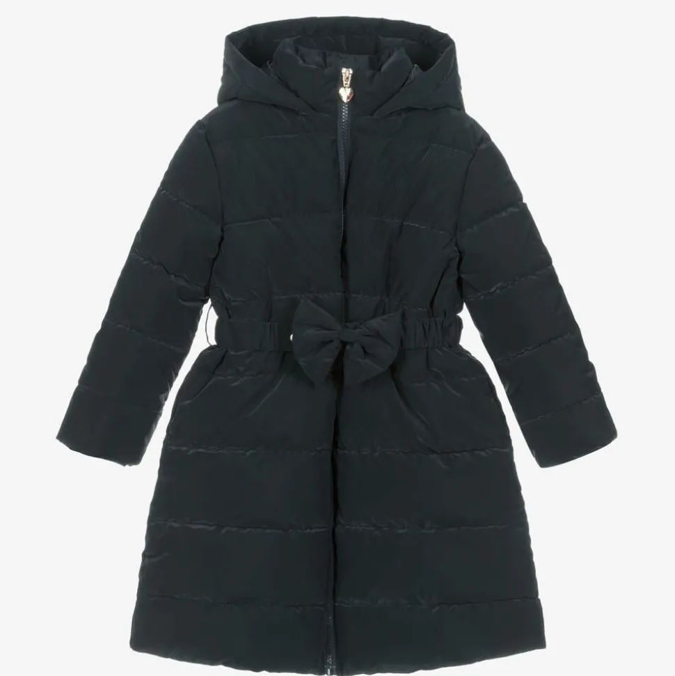 A navy blue puffer coat for girls by Caramelo Kids, with an elasticated bow belt that fastens with poppers. Made from silky, smooth fabric, this stylish hooded coat has discreet side seam pockets and a tonal logo embroidered on the chest for a subtle designer finish. Padded for extra warmth, there is a gold, heart-shaped charm on the front zip fastening for a glamorous touch.