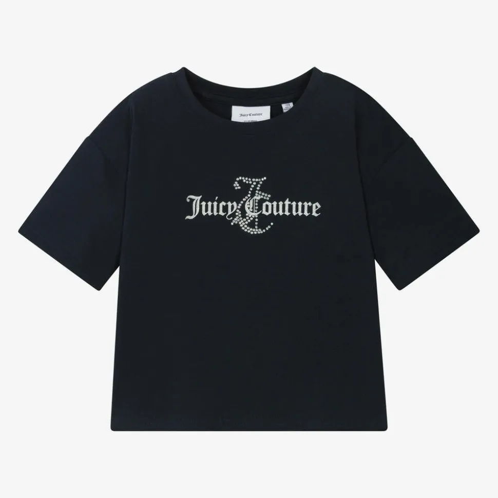 With a relaxed, boxy fit, this navy blue cotton T-shirt for girls is by Juicy Couture. Adding a little sparkle and shine, there is a glittery silver and diamanté logo on the front.