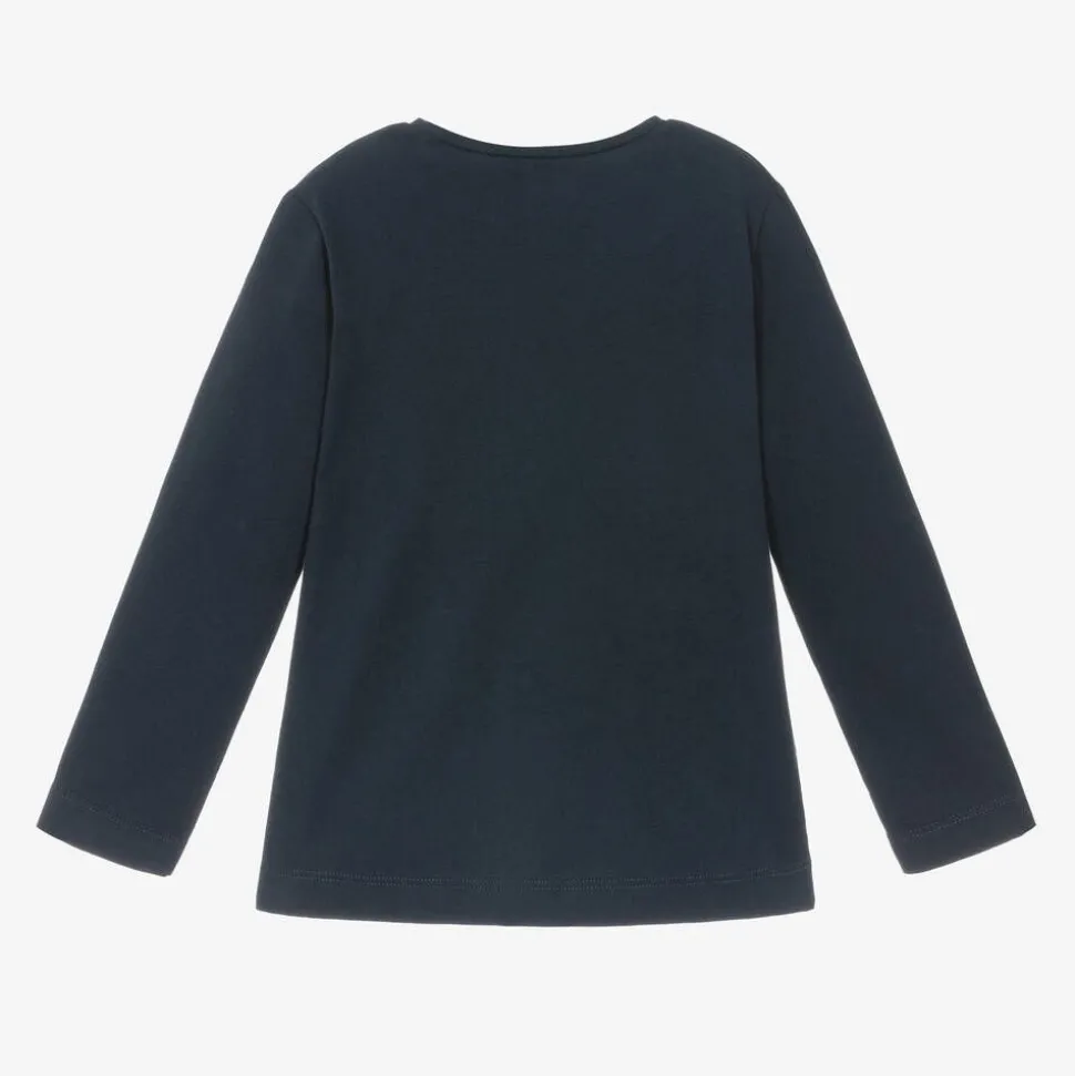 A navy blue cotton top for girls by Mayoral, made in soft jersey. Accented by silver glitter, the front has a fashion-forward outfit print with gorgeous dresses and high-heeled bow shoes.