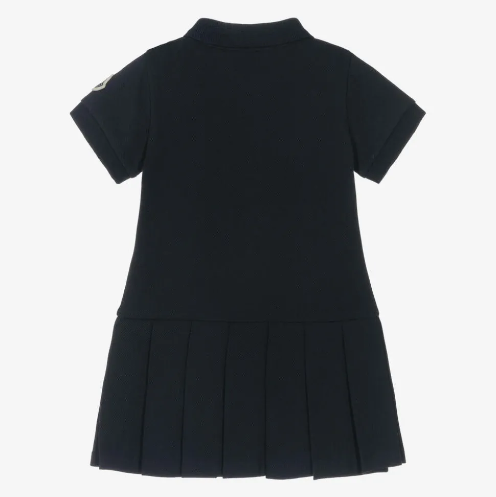 A navy blue pleated polo dress for younger girls by luxury designer Moncler Enfant. It fastens with easy-to-use, logo embossed poppers on the front. So soft and comfortable in cotton piqué, this short-sleeved dress is signed with the iconic felt patch stitched on one sleeve.