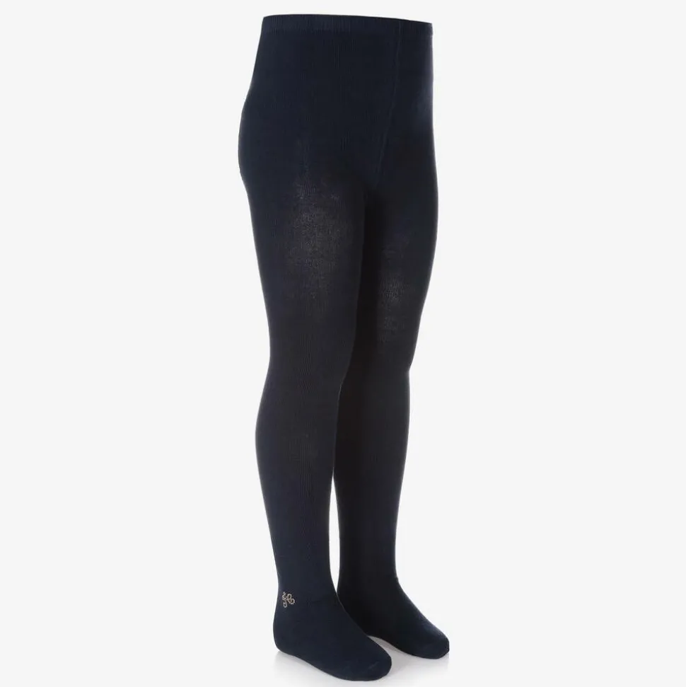 Pretty navy blue tights for girls by Tartine et Chocolat. Knitted in a soft and stretchy cotton blend, they have a sweet gold stud embellished logo on the ankle.