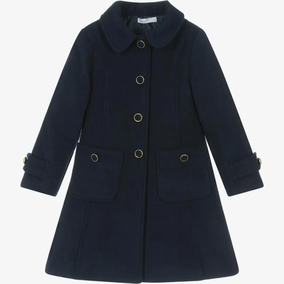 Exclusive to Childrensalon, a traditional navy blue coat for girls from Portuguese brand, Patachou. Softly woven with the feel of flannel, this coat has gold fabric-covered button fastenings on the front, and neat patch pockets. Lightly padded, it has a silky smooth lining, and is finished with a decorative strap on the back.