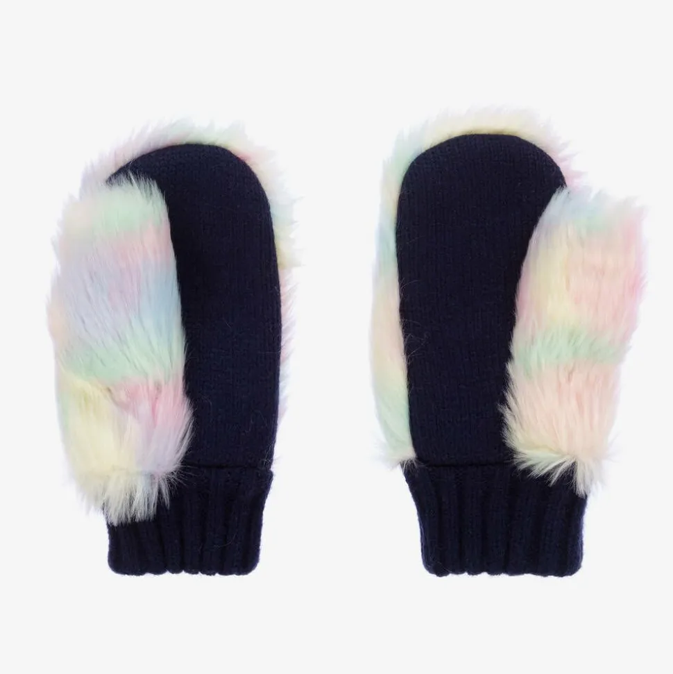 Girls Navy Blue Knit & Faux Fur Mittens