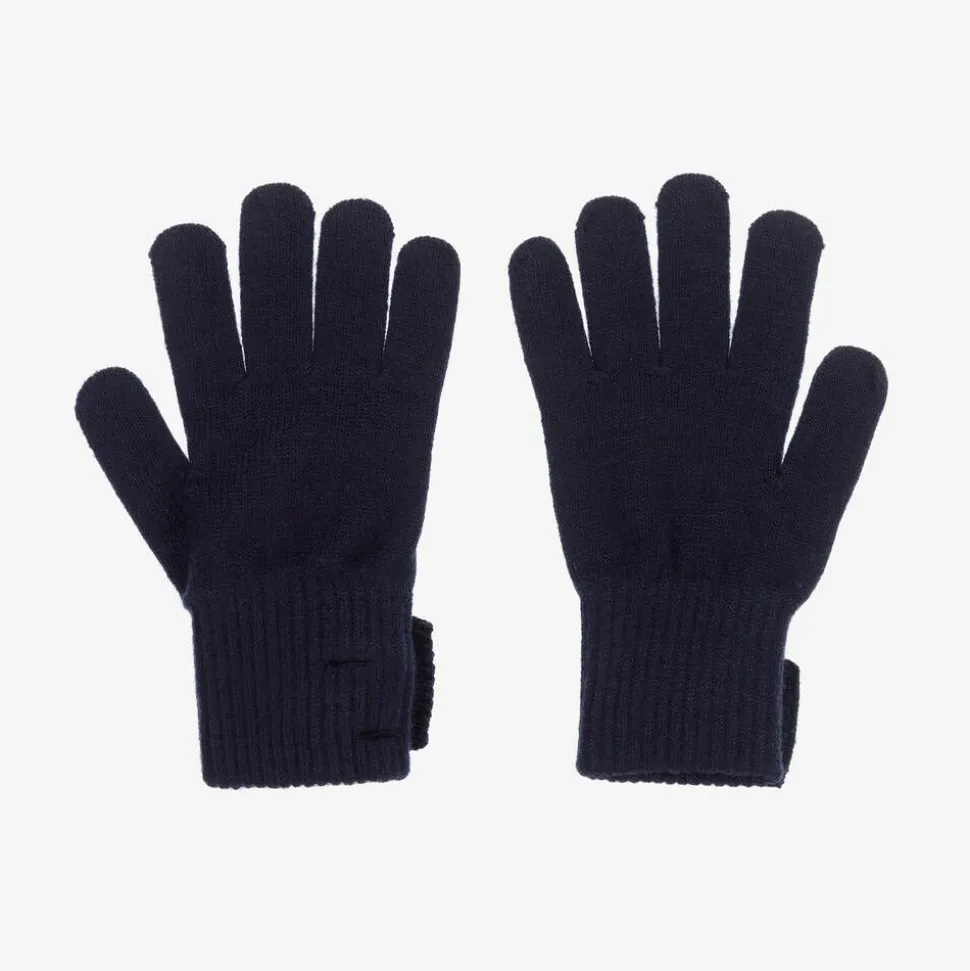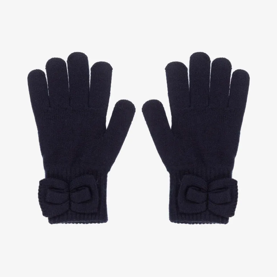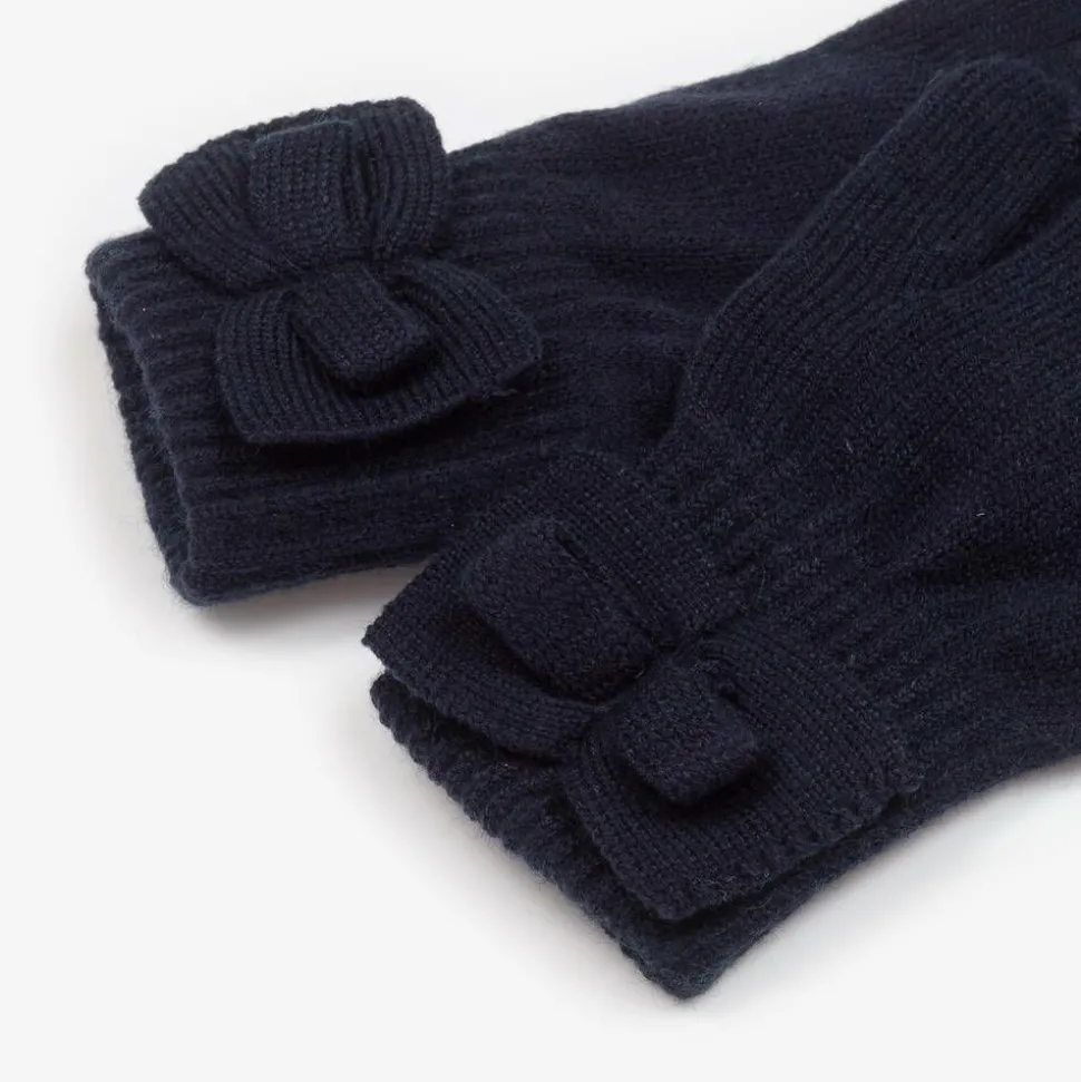 Navy blue gloves for girls by Mayoral, knitted in a soft viscose blend. These gently ribbed gloves, decorated with a pretty bow on the cuff, keep hands warm and cosy right through the colder months.
