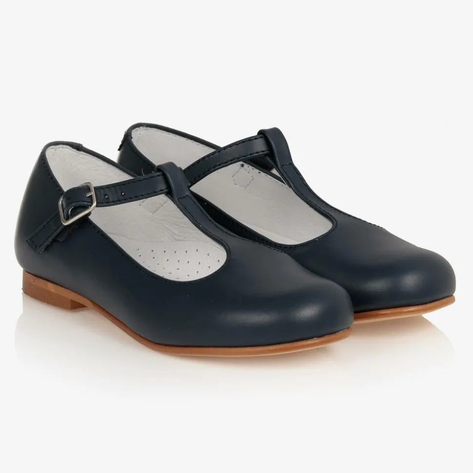 Navy blue T-bar shoes for girls by traditional British brand Beatrice & George, exclusive to Childrensalon. Made in soft, supple leather, they have a cushioned footbed for comfort and a super soft leather lining. They fasten with a silver buckle and have a faux leather outer sole.