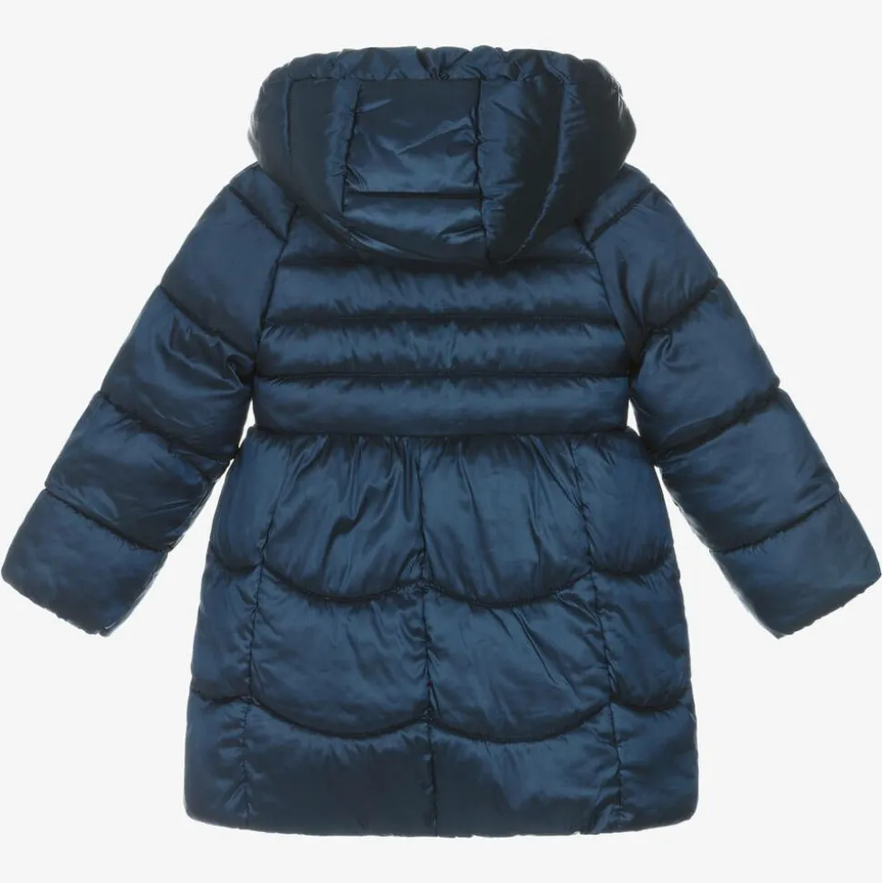 A navy blue puffer coat for little girls by Mayoral, made in a silky smooth fabric with lightweight recycled padding. Great for keeping her warm, this zip-up coat has an elasticated hood and a fleece-lined bodice. There is a metal logo on the front.
