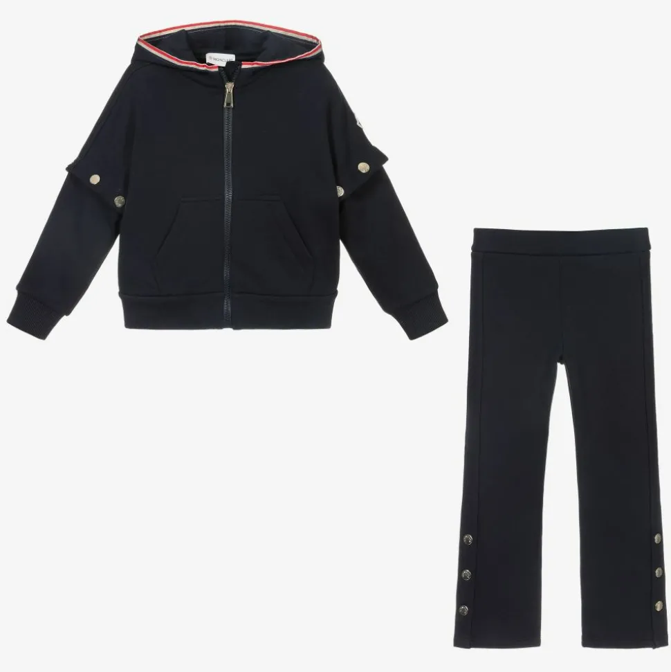 Sporty navy blue tracksuit for girls by French brand Moncler Enfant. Press studs on the sleeves allow the top to be worn with either long or short sleeves. The hooded zip-up top has sparkly gold and tricolour trims and a pouch pocket. The joggers have press stud closures at the sides, so can be worn open or closed for a relaxed look.