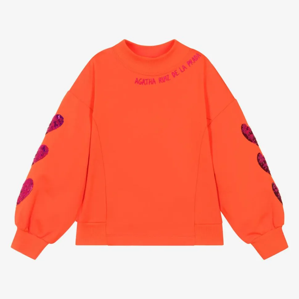Bright orange cotton sweatshirt for girls by Agatha Ruiz de la Prada, with the brand's signature hearts appliquéd on the long sleeves, shimmering in fuchsia pink sequins. Made in comfortable jersey, with a cosy, fleecy inside and ribbed trims, it has an embroidered pink logo by the neckline and panelled detailing on the front.