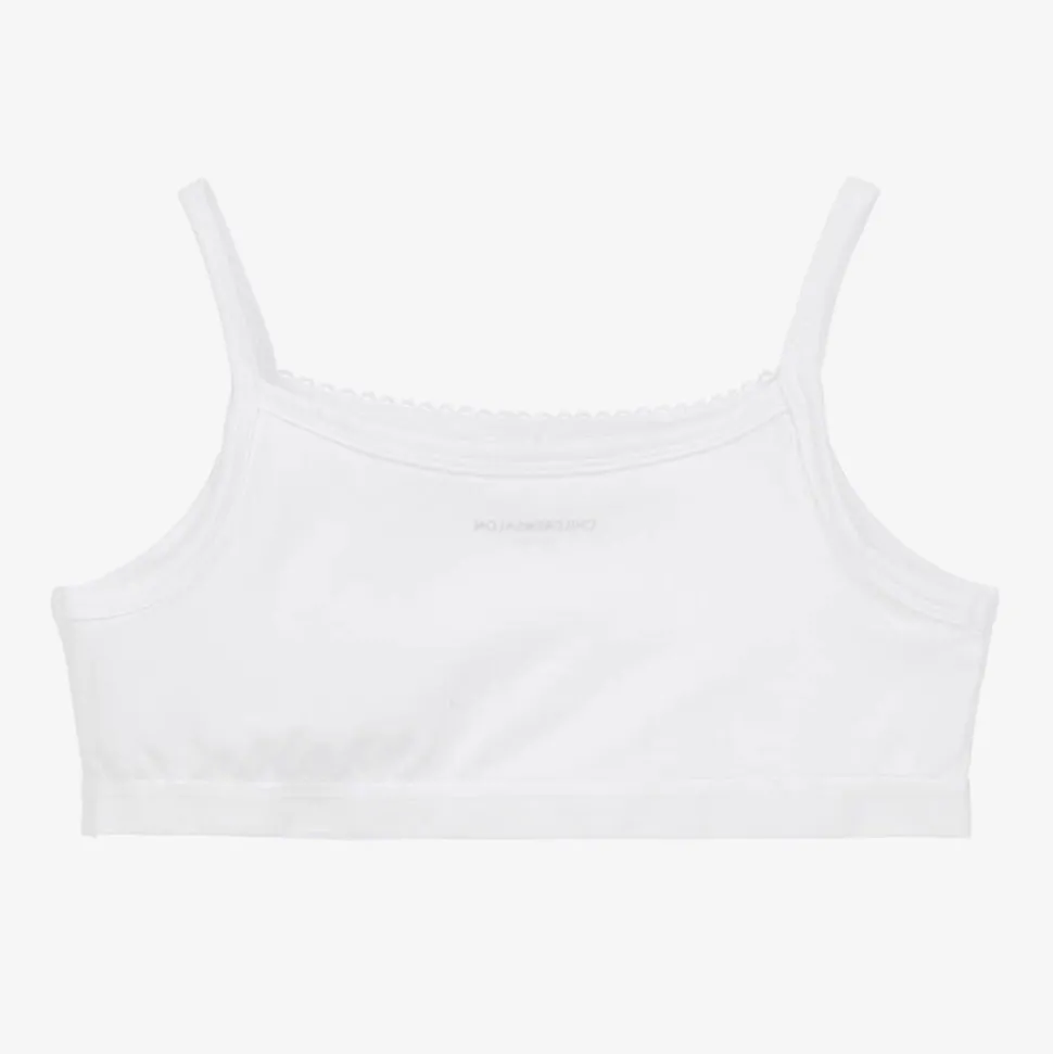 Pack of three organic cotton vests for girls by Childrensalon Essentials. Made in soft, comfortable jersey, they have a sweet picot trim and a small satin ribbon bow on the front. There are narrow shoulder straps and a gently elasticated hemline for a neat fit.