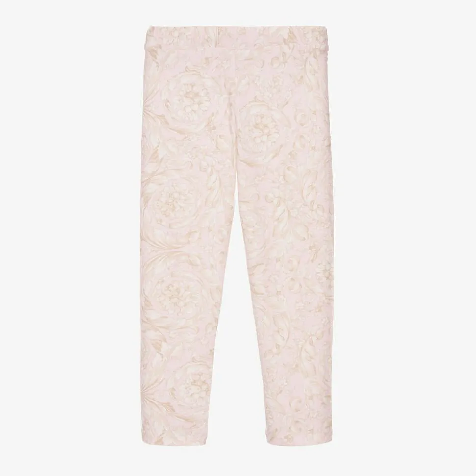 Girls pink cotton full-length leggings by luxury label Versace, patterned with the brand's ornate Barocco print in soft ivory hues. Both stylish and comfortable, they are made from soft jersey with a stretchy elasticated waistband.