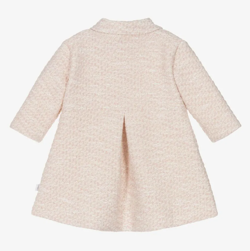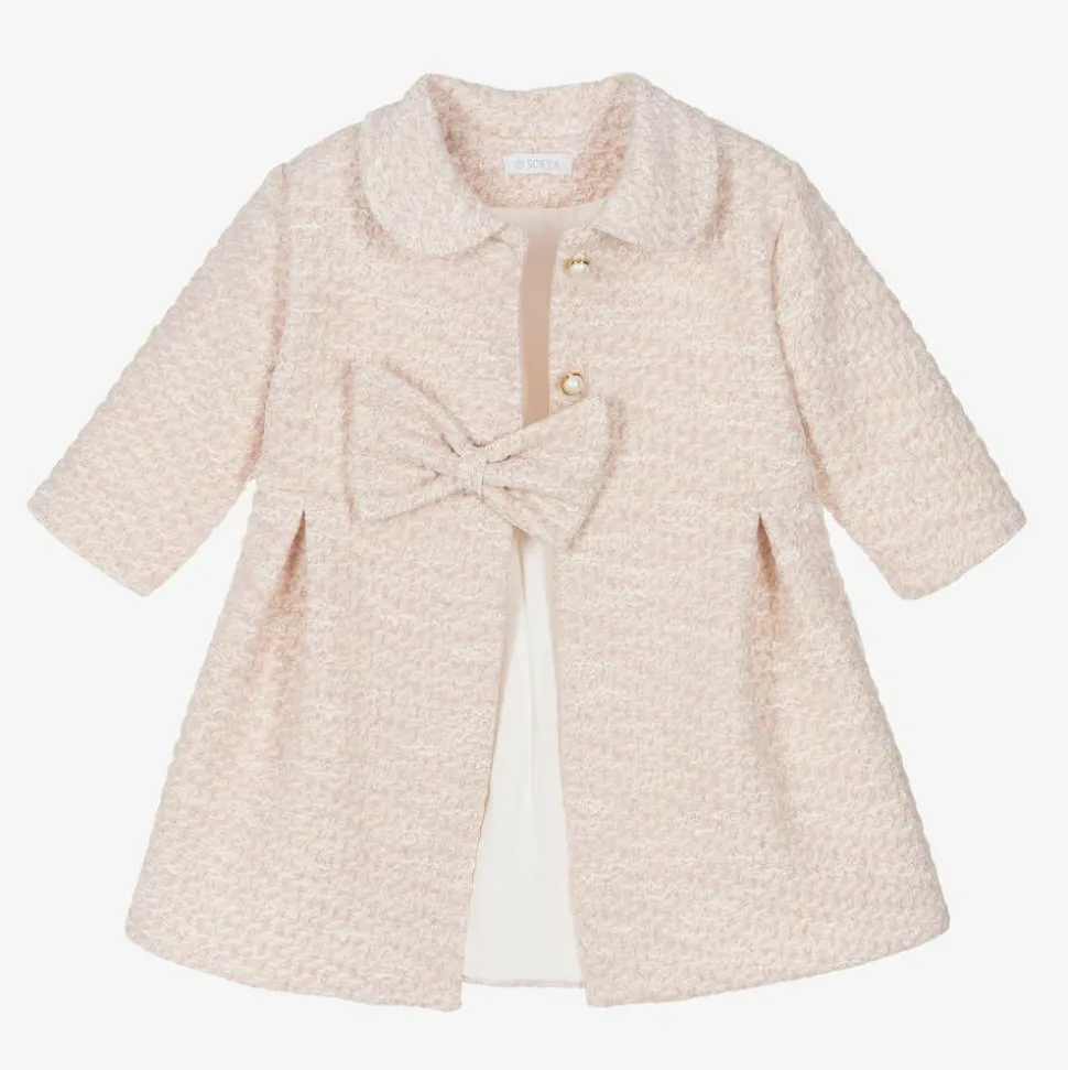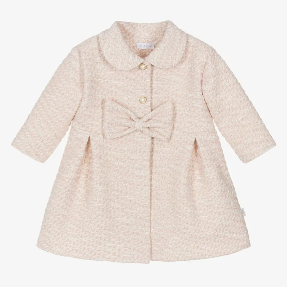 A traditional pale pink coat for younger girls by Sofija, made in tweed-effect cotton with a lovely soft feel. Woven with a glittery gold thread for a subtle shimmer, this classic piece is lined in cotton jersey for comfort. It fastens with faux pearl buttons and has a decorative bow on the front for a pretty finish.