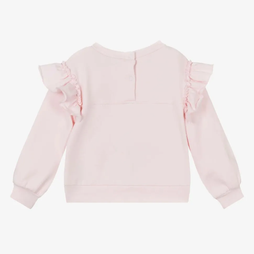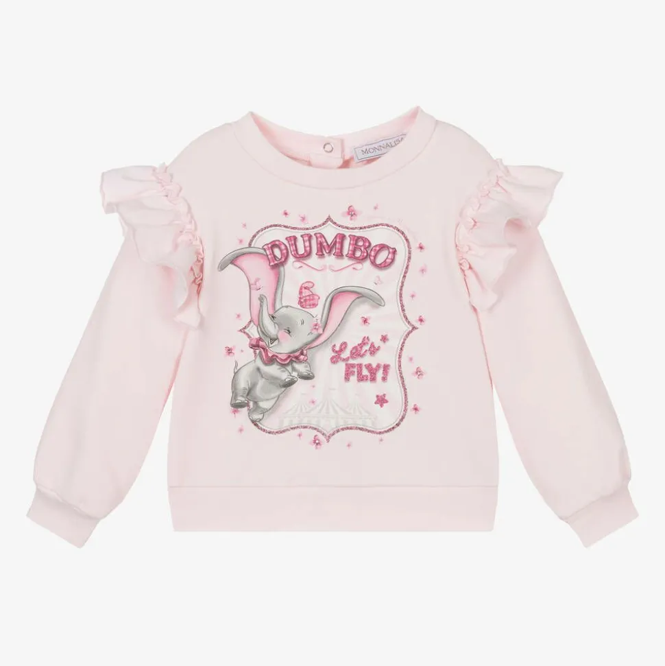 Pink sweatshirt for little girls by Monnalisa, made in soft cotton jersey with a warm, fleecy inside. Cosy and comfortable, this casual top has ribbed trims and sweet ruffles over the shoulders. The front features a cute Dumbo print with pink glittery trims and diamantés. This fun top fastens with poppers on the back.