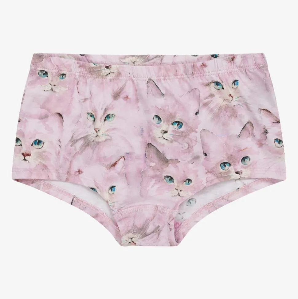 In a lovely pack of two, these knickers for girls by Molo are made from soft organic cotton jersey. One pair are in a plain lavender pink shade, and the other has a cute watercolour kitten pattern. Both pieces have elasticated waistbands for a comfortable fit.