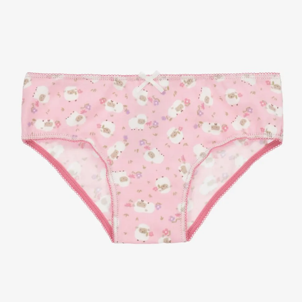 Pack of four pink knickers for girls by Mayoral, made in soft cotton jersey. One is plain pink, whilst the others are patterned with sweet florals, polka dots or lambs. They have picot-edged, elasticated trims for a comfortable fit.