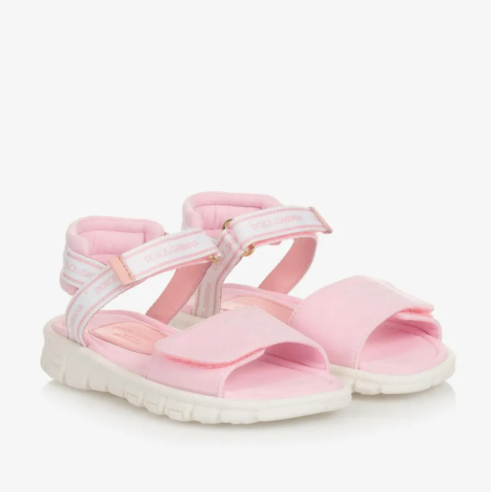 Cool pink sandals for little girls by Dolce & Gabbana. Fastening with practical velcro straps, they are stitched with a crossover DG logo outline on the front strap and have repeat logo detailing around the ankle. Made and lined in soft textile, they have lightly padded insoles for extra comfort and non-slip rubber outsoles with deep treads for good grip.