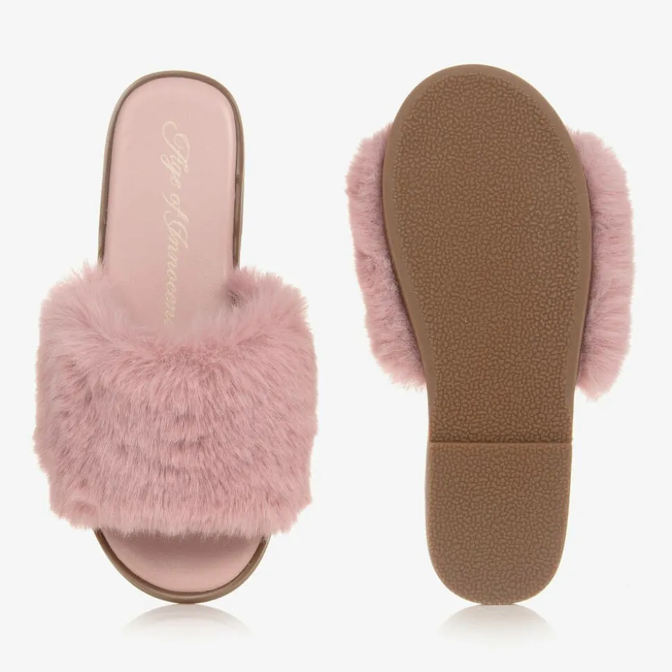 Pink sliders for girls, handcrafted by Age of Innocence, made from super soft faux fur. Easy to slip on, they are lined in smooth leather and have a lightly padded insole for added comfort. They have a flexible slim brown non-slip rubber outsole for better grip.