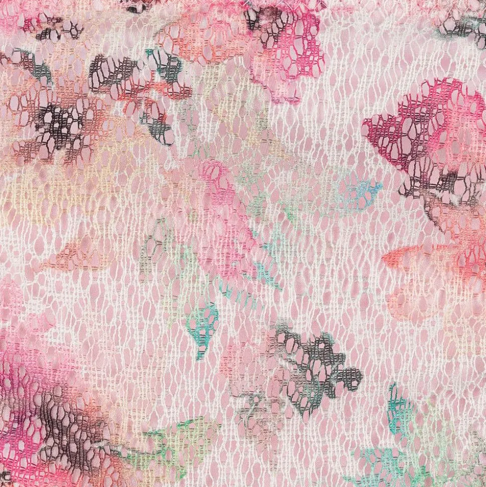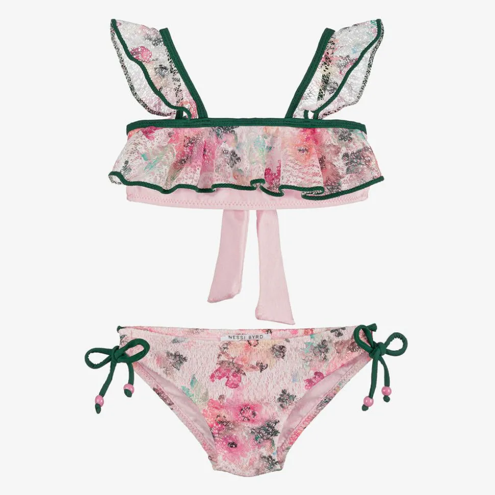 A pretty pink bikini for girls by American brand Nessi Byrd. With an ultraviolet protection factor of 50, the shimmery pink, stretchy fabric is overlaid with light white lace. It is beautifully patterned with watercolour-style flowers in hues of pink, green and yellow. Tied easily on the back, the bikini top has frilly shoulder straps and gently elasticated trims in a dark shade of green. The matching bottoms have an elasticated waistband and tie fastenings on each side with decorative pink beading.