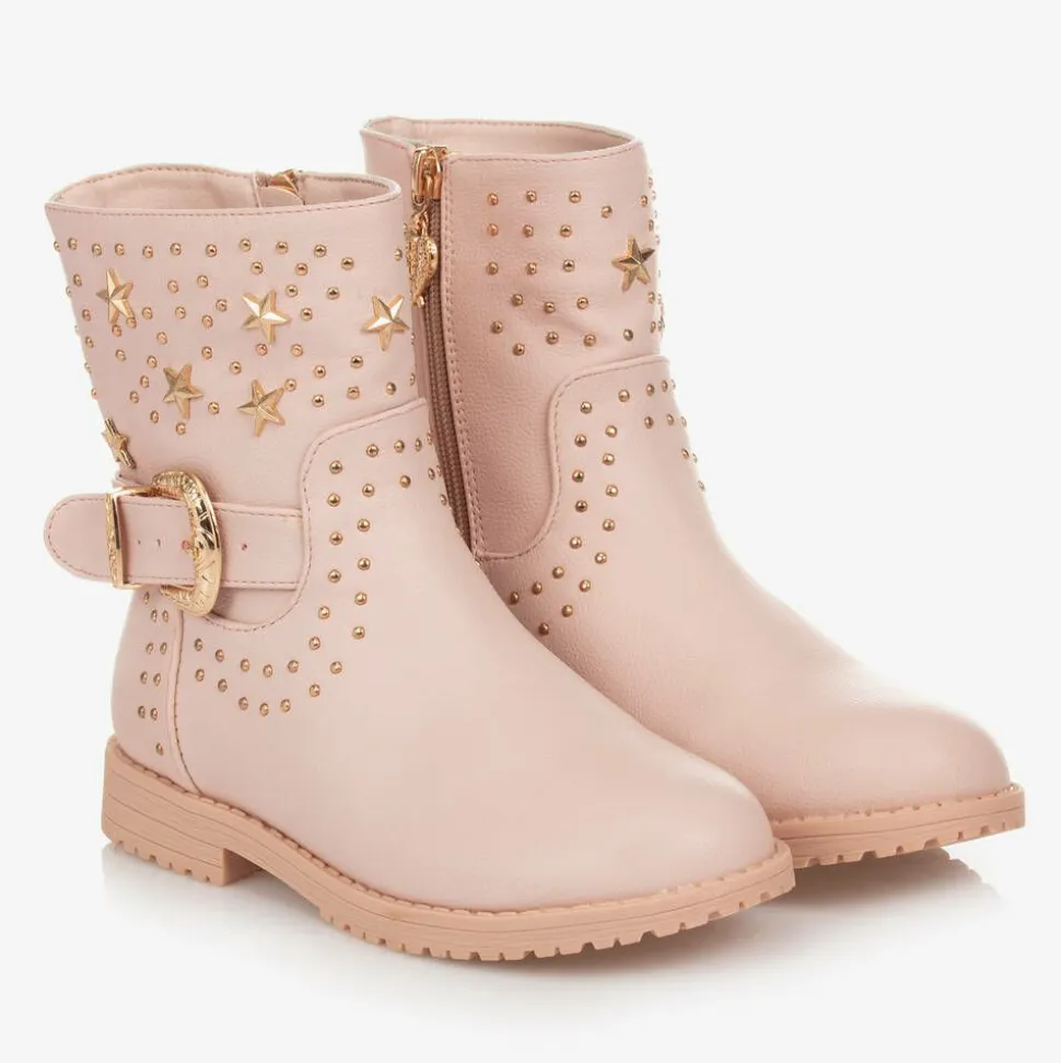 Glamorous pale pink boots for girls by Angel's Face, made in soft faux leather with golden studs and stars. They have a belt trim with an adjustable, golden buckle for a stylish look. Lined in comfortable fabric, they have a side zip fastening and non-slip rubber soles.