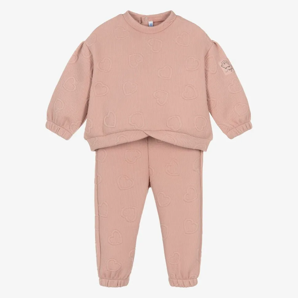 Cute and comfortable, this dusky pink tracksuit for little girls is from Spanish brand Mayoral. This casual pairing is made in a mid-weight, viscose blend jersey with a lovely jacquard heart pattern, a ribbed texture and elasticated cuffs. In a relaxed boxy fit, the top has dropped shoulders, puffed long sleeves and a logo patch with an adorable hedgehog on one side. It fastens on the back with poppers. The joggers have faux pocket detailing and an elasticated waistband for quick pull-on.