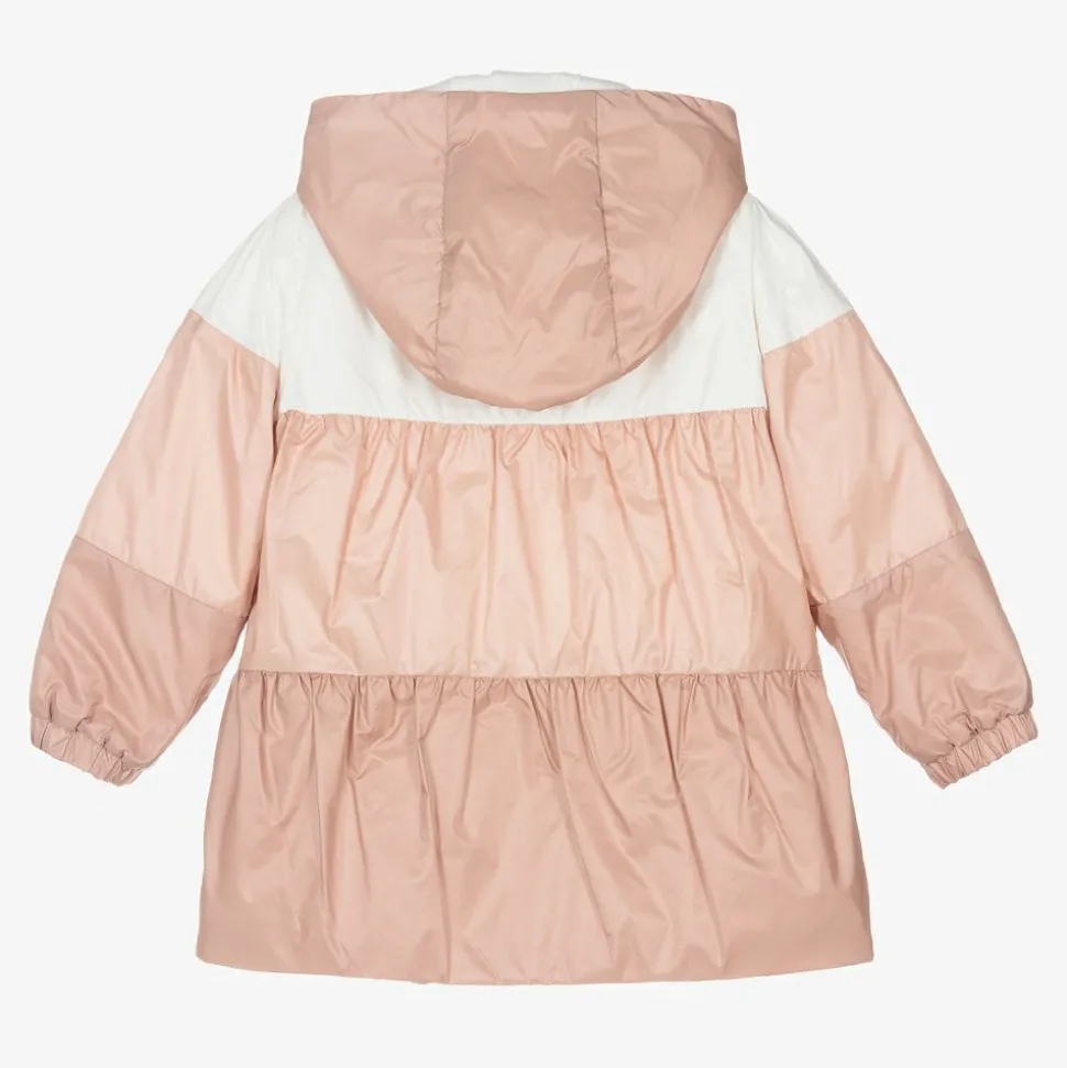 Dusky pink and white water repellent zip-up jacket for little girls, by luxury brand Moncler Enfant. Made in silky nylon with a matte-chic feel, it has the iconic felt logo on one sleeve, pretty tiered details, and a cotton lining for comfort.