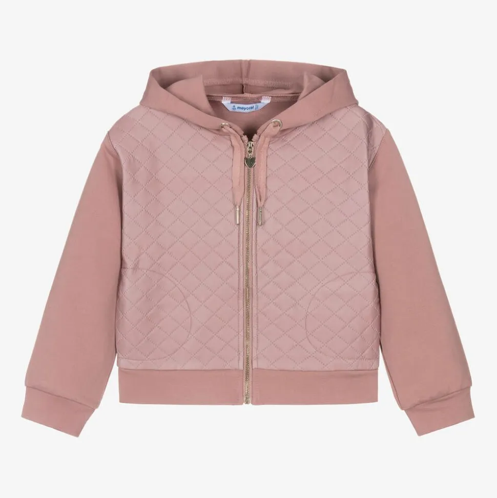 Pink hooded zip-up top for girls by Mayoral, made in soft Milano jersey. Elevating the casual style, it has a quilted, faux leather front and useful side seam pockets. To complete the look, the hood is detailed with faux ties and the gold tone zip fastening has a lovely heart-shaped pull.