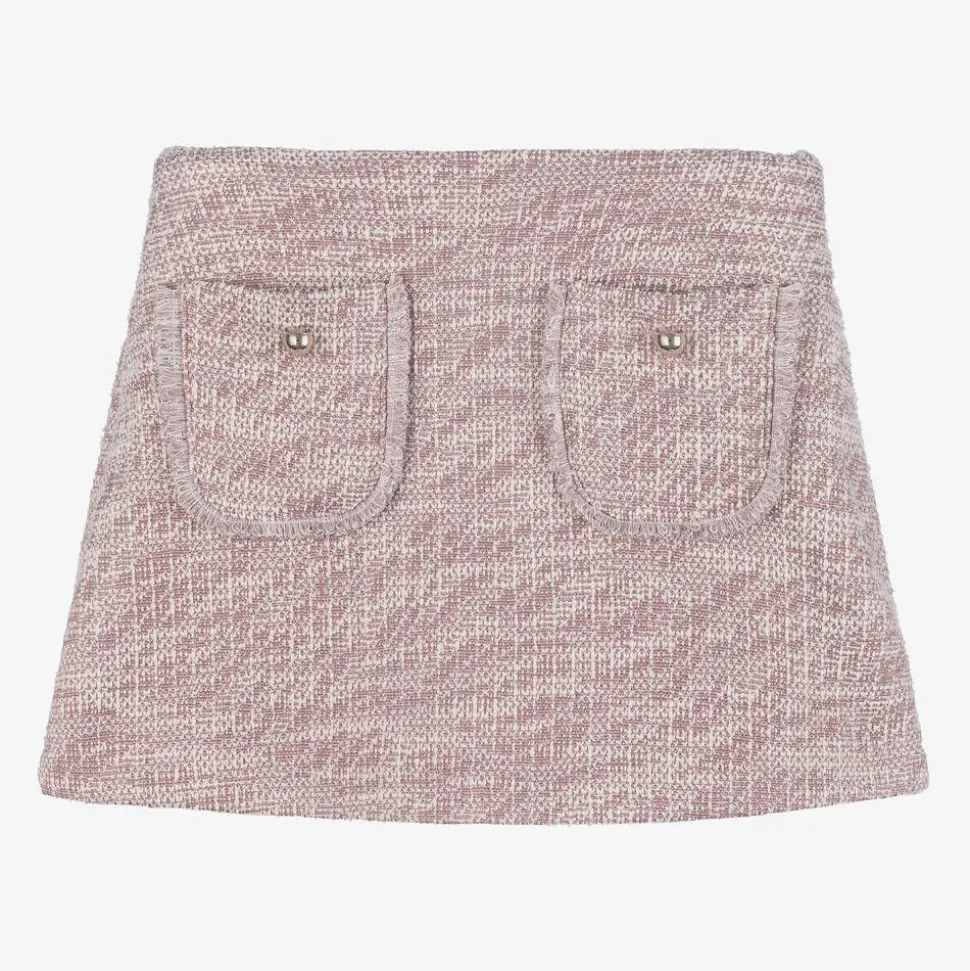 Pink and ivory tweed effect skort for girls by Mayoral. It is made in a mid-weight, cotton blend jersey with glittery threads for added sparkle. Casual but stylish, it has patch pockets on the front, trimmed with pretty frayed detailing and faux buttons. It has a useful adjustable waist for a comfortable fit.