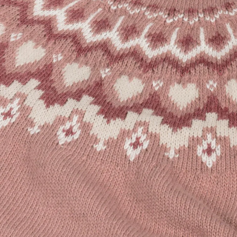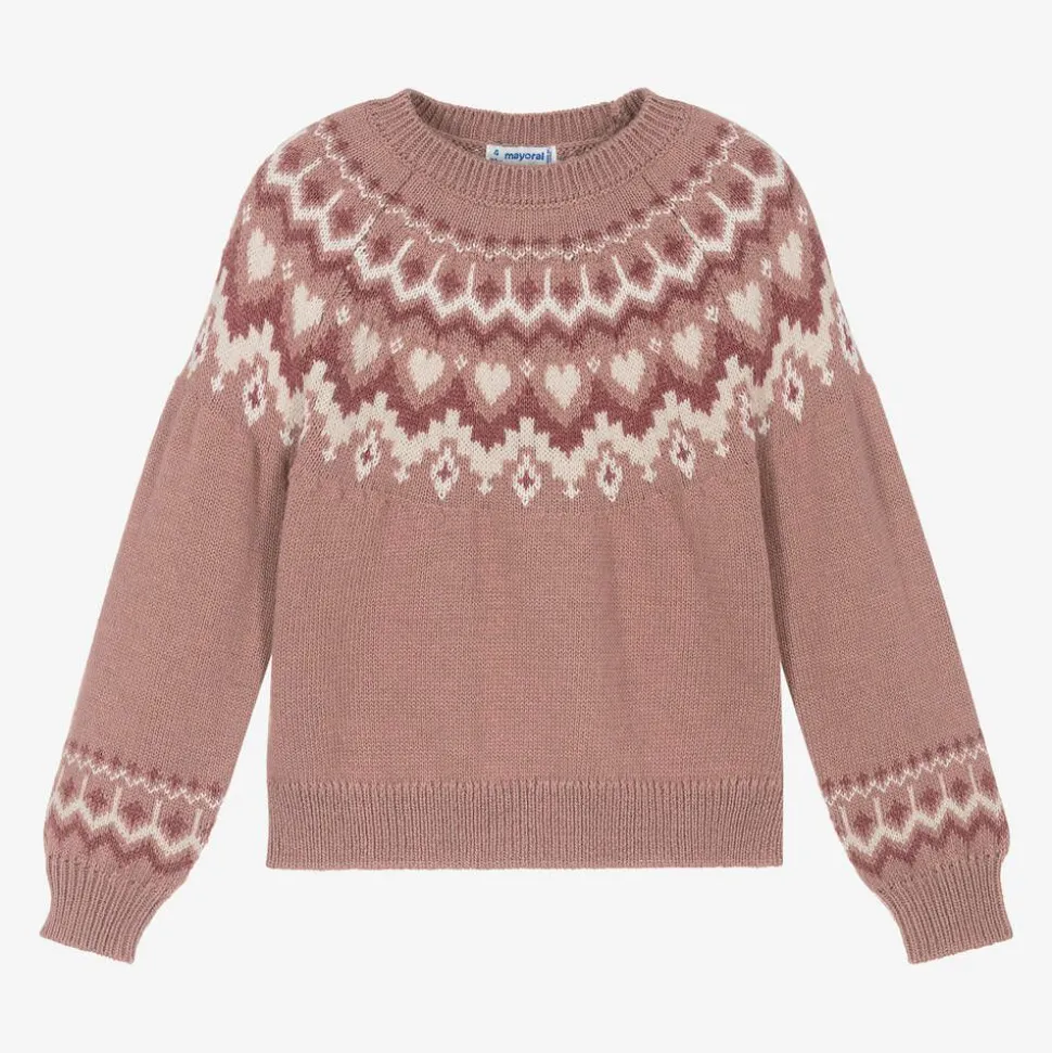 A lovely pink jumper for girls by Mayoral with a Fair Isle pattern in shades of pink and ivory. Softly knitted with a touch of wool, this cosy style has a crew neck and raglan sleeves.