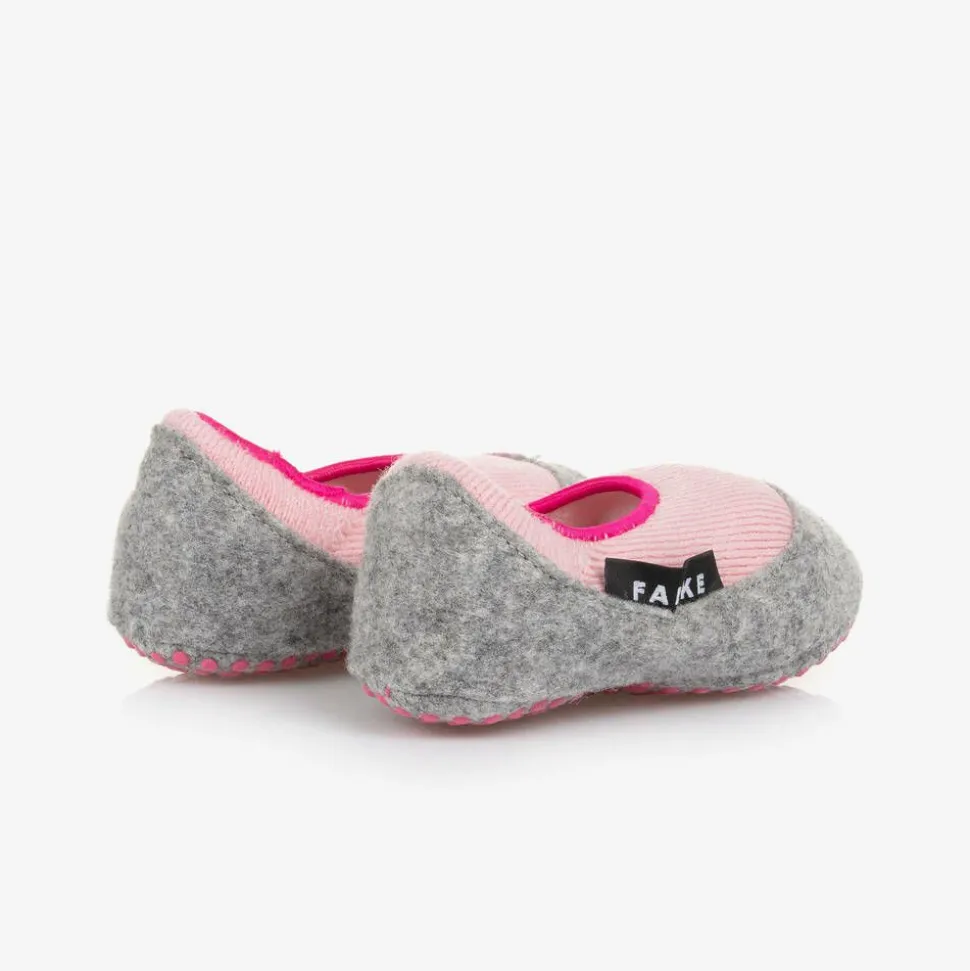 Cosy pink and grey slippers for girls by Falke, made from a warm Merino wool blend. The pink upper is knitted with a looped stitch inside for warmth and there are printed dots on the outsoles for improved grip.