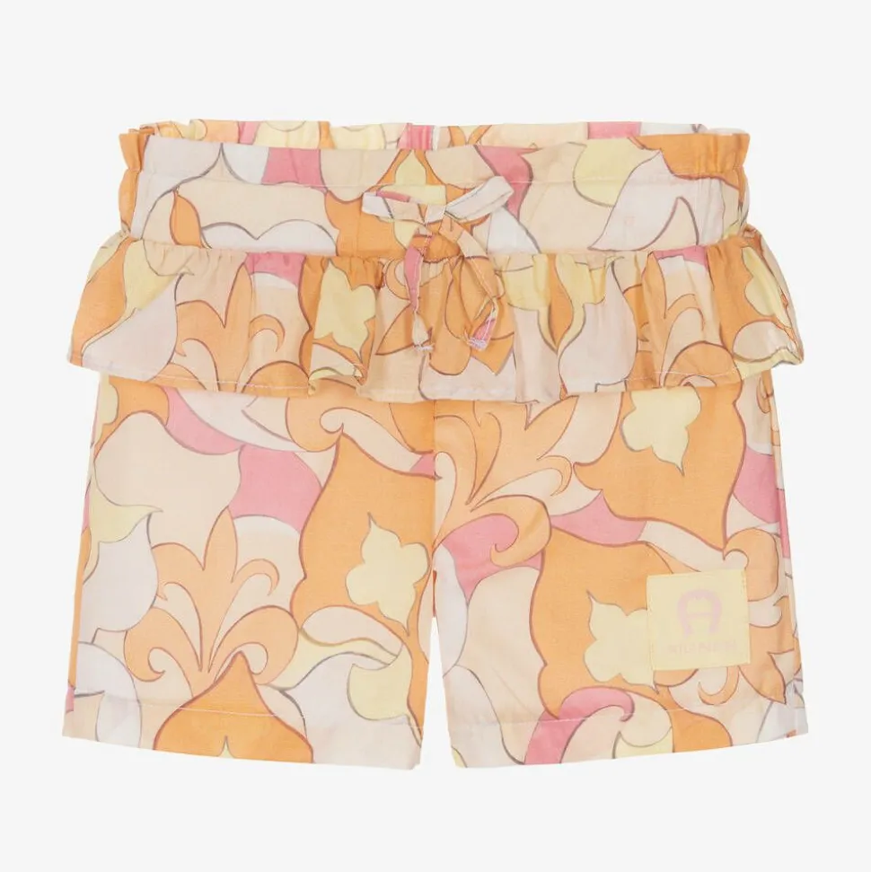 Cute cotton shorts for little girls by AIGNER, with an ornate pattern in pink and pale orange. Made for summery days in lightweight poplin, they have frills around the waist and are easy to wear, simply pulling up. The signature 'A' horseshoe logo badge is on one leg.