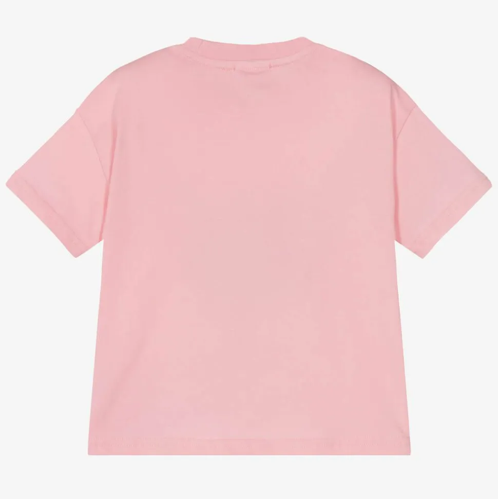 A lovely pink organic cotton T-shirt for girls by Lacoste, designed in a loose fit. This crew neck tee has a cute, tennis-inspired vintage flower motif in a faded print. The French label's iconic green crocodile logo can be seen by the hem.